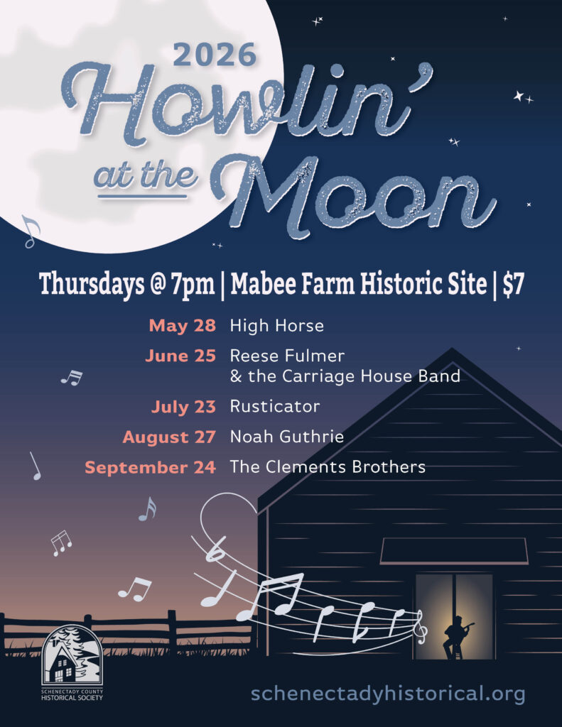 Everest Rising is proud to present the line-up for the 2026 Howlin’ at the Moon Concert Series, which showcases local and regional music from a variety of genres including but not limited to bluegrass, Americana, indie, bluegrass, folk, and more. The concert series is presented by the Schenectady County Historial Society at the Mabee Farm Historic Site to provide an authentic musical experience for both audience and musicians, set in a 1760 Dutch Barn that inspires and reminds us of our place within history. The “Howlin’ at the Moon” Concert Series was originated by Dale and Joan Wade-Keszey in 2008 and is currently in its 18th season.